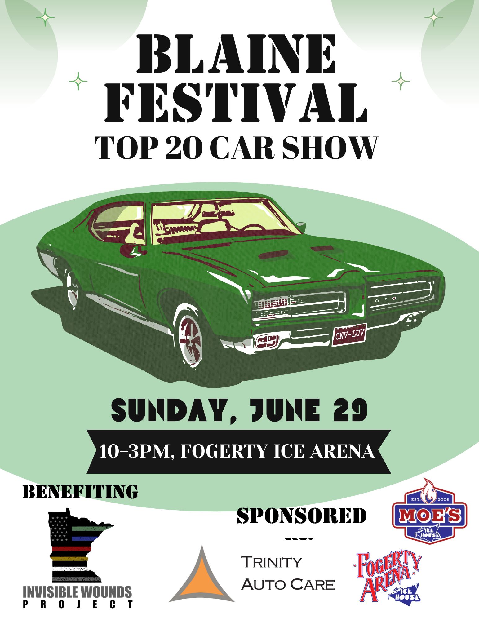 The Blaine Festival Top 20 Car Show benefiting the Invisible Wounds Project is happening on Sunday, June 29, 2025, at Moes Ice House at Fogerty Arena from 10 a.m. to 3 p.m. The event will feature participant voting, live music, food specials, fundraising activities, and more. Entry costs $10 per vehicle