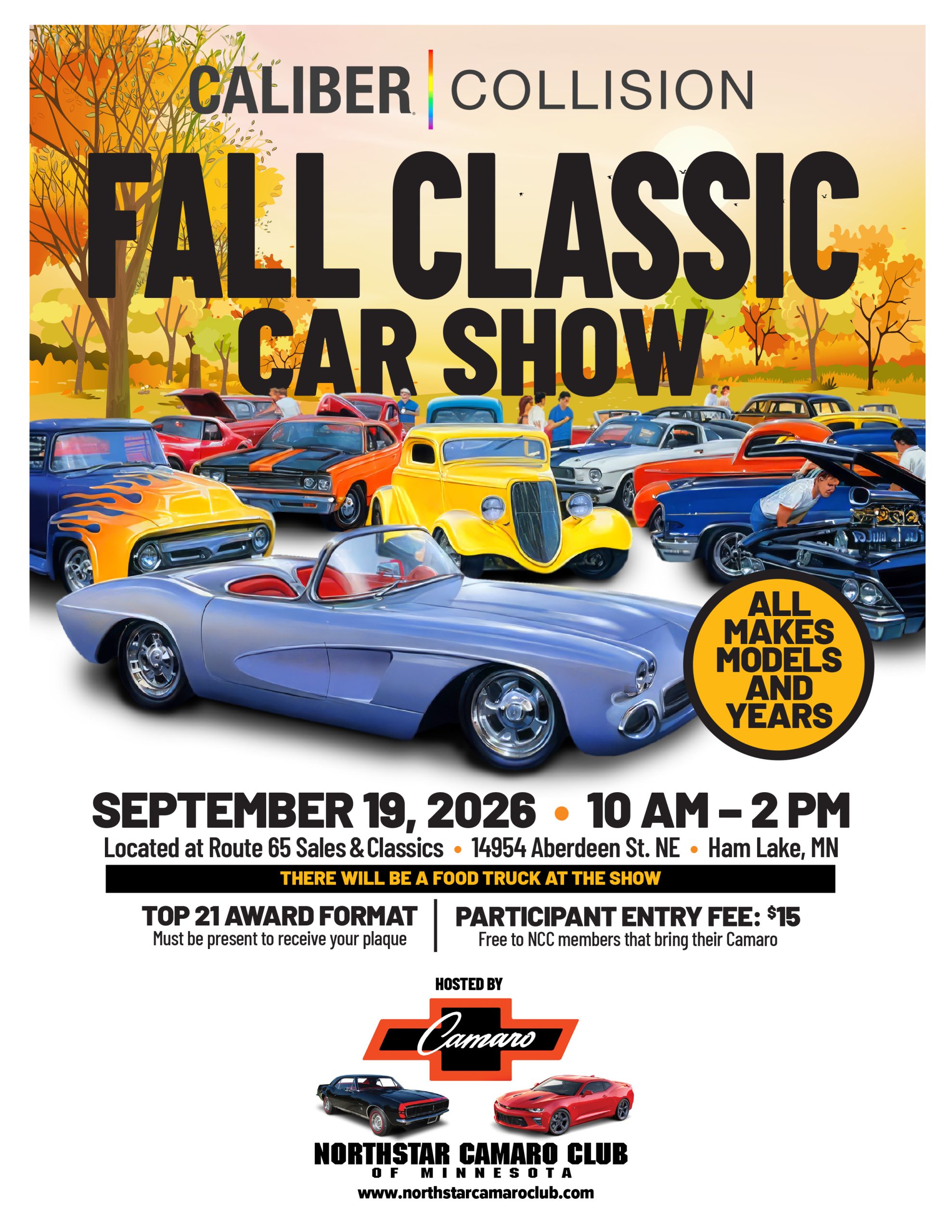 Route 65 Sales & Classics 14954 Aberdeen Street Northeast, Ham Lake, MN, United StatesJoin us for our 2nd Annual fall car show with Caliber Collison. Our Fall Classic Car Show returns to Route 65 Sales & Classics (14954 Aberdeen St NE, Han Lake, MN 55304) All makes, models, and years are invited to attend. $15 participant entry fee--participant voting--Free to current NCC members that bring their Camaro. The […]